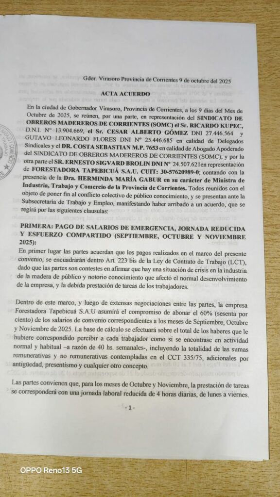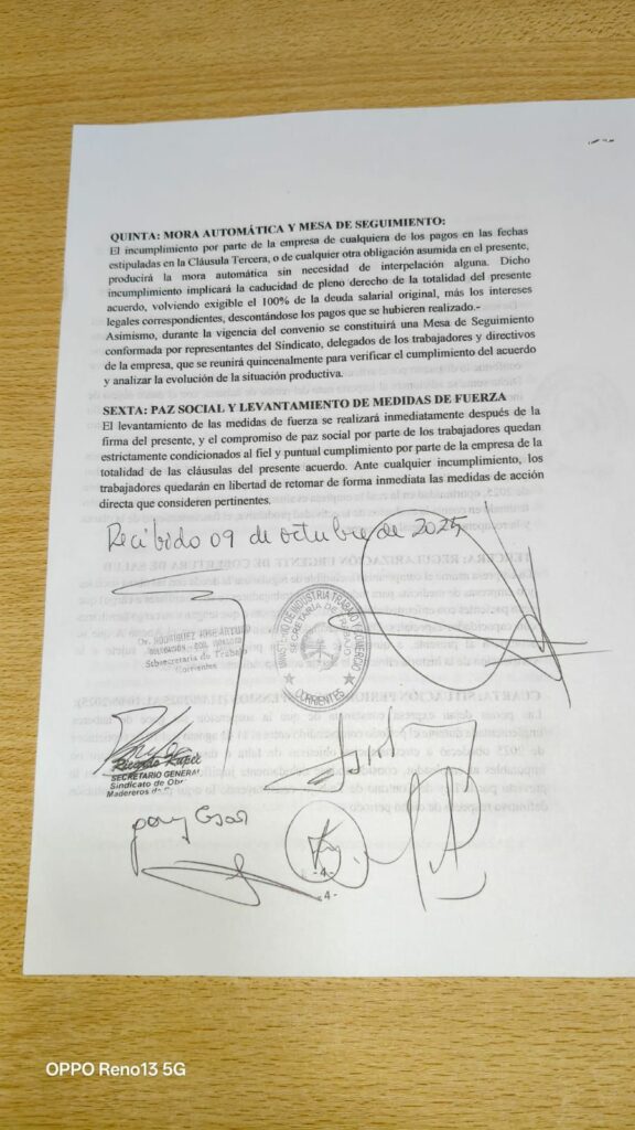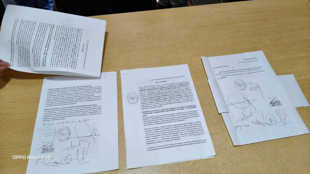 El acuerdo, homologado por la Secretaría de Trabajo provincial, garantiza la preservación de más de 400 puestos de trabajo y el pago de haberes adeudados, en un contexto de crisis económica que afectó a unas 500 familias en esta localidad del noreste correntino.